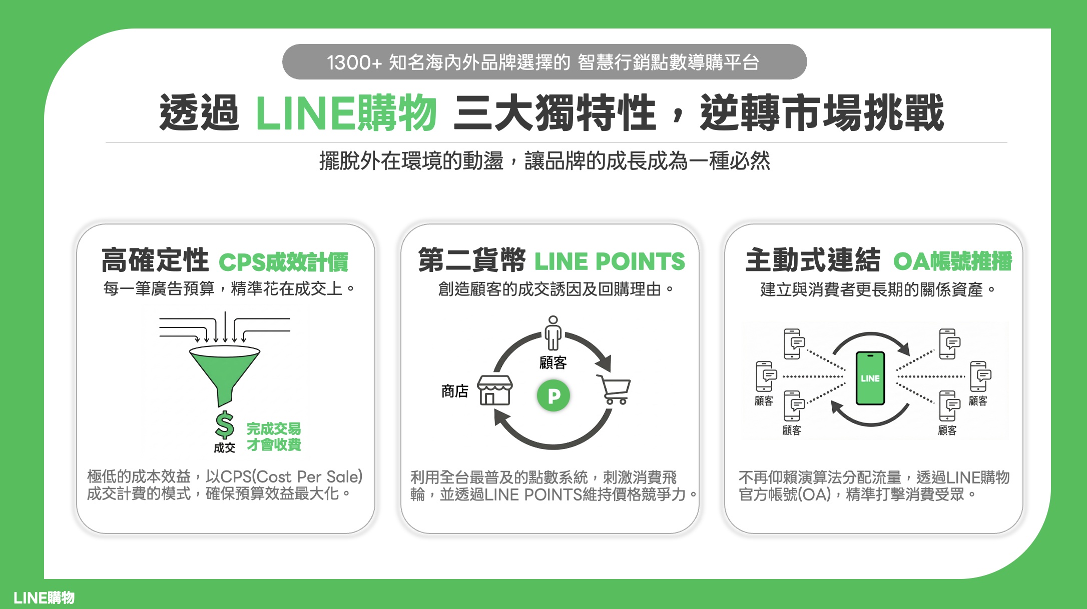 面對上述不可控的變局,品牌需要的是一個「高穩定性」的增長引擎 。LINE 購物憑藉著 1,300 多家海內外知名品牌的合作經驗,提出三大獨特性來逆轉挑戰 :