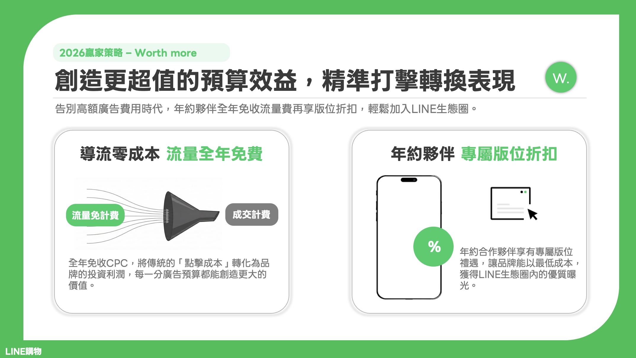 高確定性的 CPS 計價: 不同於傳統廣告的流量賭博,LINE 購物採取成交計費(Cost Per Sale)模式,確保每一筆預算都花在實際的業績上,極大化成本效益 。