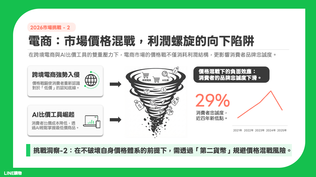 2. 價格戰泥淖與 AI 比價的夾擊 跨境電商強勢入侵,價格戰迫使消費者重新定義對「低價」的認知底線 。此外,AI 比價工具的崛起大幅降低了消費者的比價成本,品牌忠誠度因此面臨嚴峻挑戰,數據顯示消費者忠誠度已跌至近四年新低,僅剩 29% 。這導致市場陷入「利潤螺旋向下」的陷阱 。