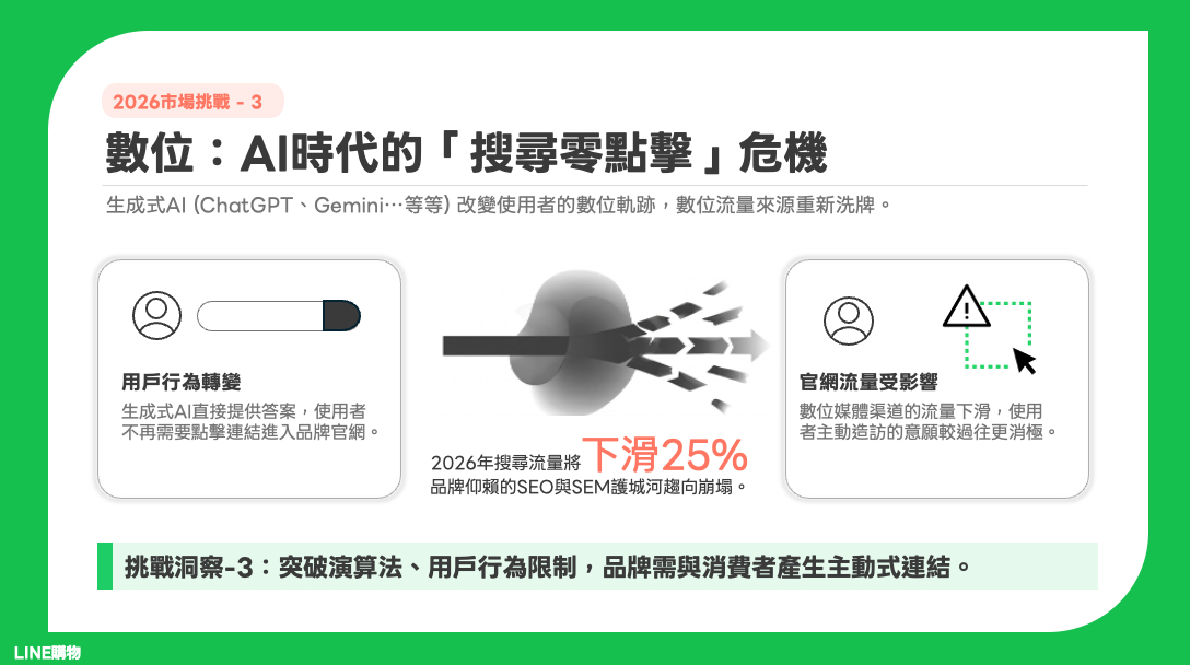 3. 「搜尋零點擊」危機,流量來源重新洗牌 生成式 AI(如 ChatGPT、Gemini)正在改變使用者的數位軌跡。當 AI 直接提供答案,使用者不再需要點擊進入品牌官網,導致 SEO 與 SEM 的護城河趨向崩塌 。預測指出,2026 年搜尋流量將下滑 25%,品牌面臨主動造訪意願降低的困境,亟需突破演算法限制,建立主動式的連結 。