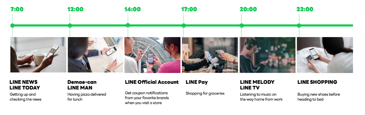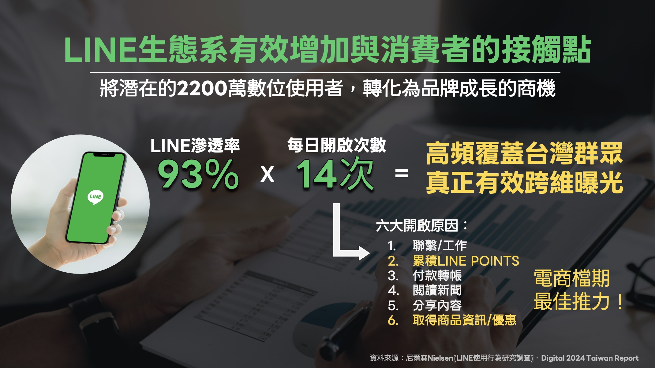 LINE之所以是品牌最佳選擇,關鍵在於生態圈的高頻覆蓋、深度黏著,能幫助品牌降低獲客成本,特別是提供跨域場景減少行銷摩擦力。加上LINE成為「聚合消費者行為與數據」的生活平台,每位用戶24小時有不同理由(例如聯繫/工作、付款轉帳、閱讀新聞等)開啟LINE,六大開啟原因之中有兩項:「累積LINE POINTS點數」、「取得商品資訊跟優惠」正是品牌電商的最佳推力。