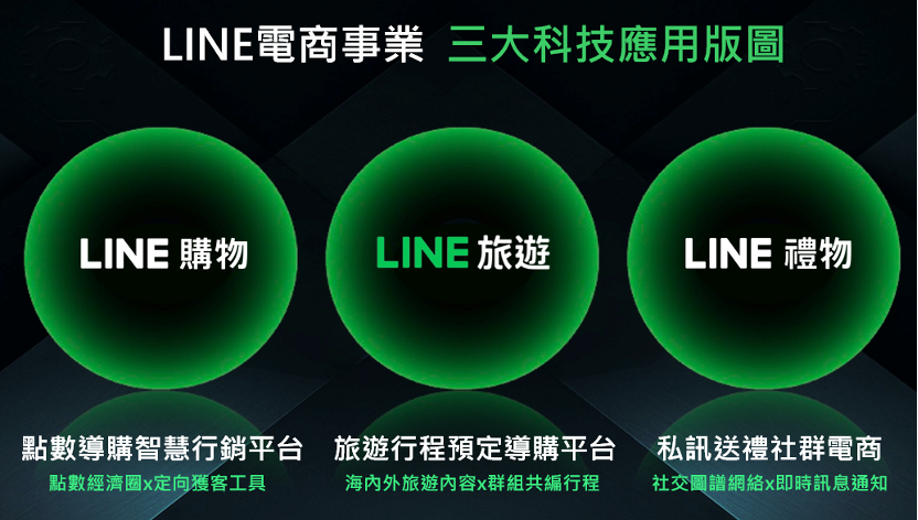 目前LINE電商事業涵蓋:LINE購物、LINE旅遊、LINE禮物,這三個應用版圖結合三大護城河,有助於奠定電商品牌的營收韌性基石。三大護城河優勢分別是:(1)人際網絡中的訊息場景;具有黏著度比較高的特性 (2)流通性最高LINE POINTS;市面上最大的點數系統 (3) 定向行銷的成效機制,透過多元行銷方式幫助品牌獲得更好表現。
