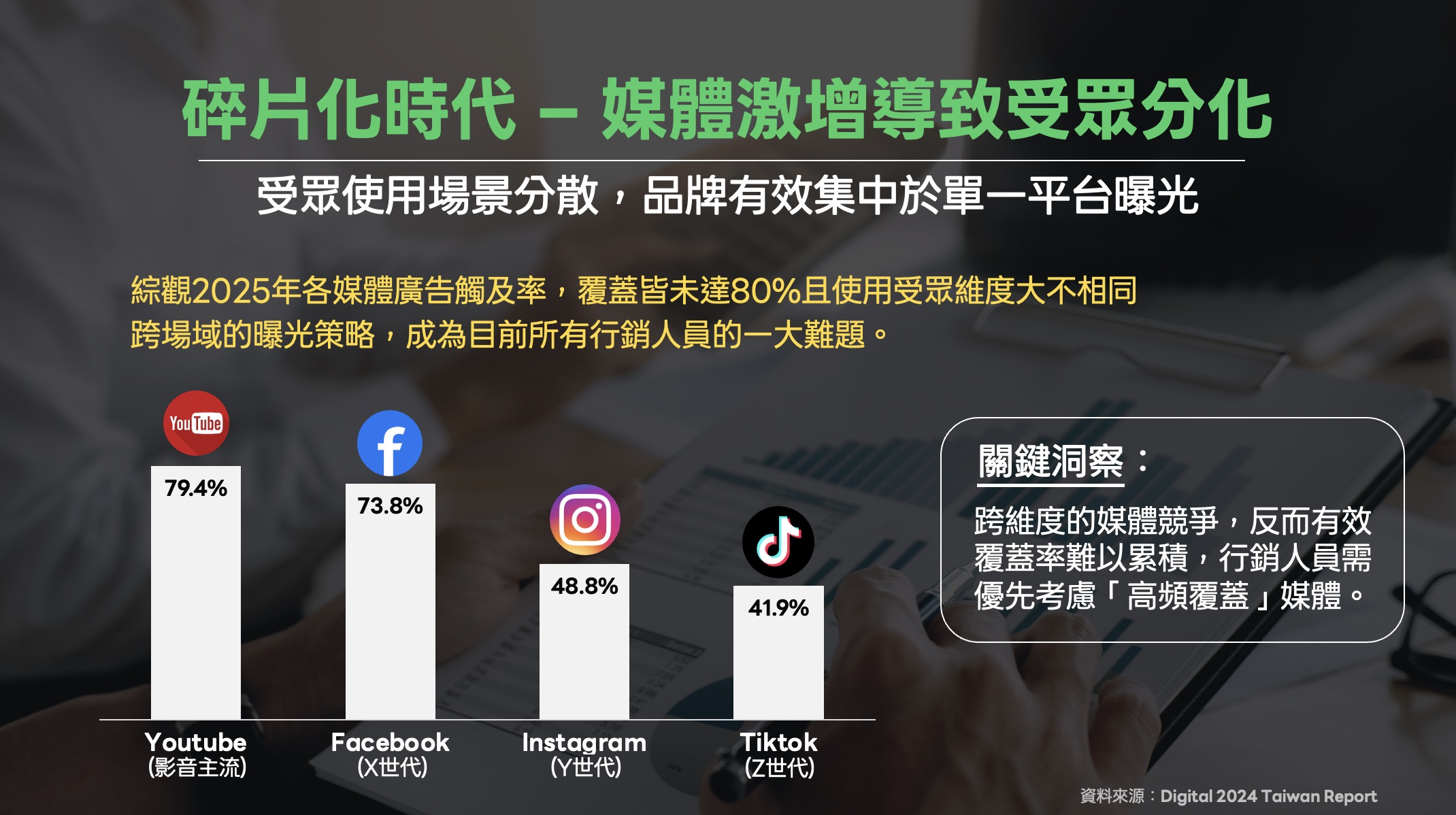 針對受眾分化,綜觀2025年各媒體廣告觸及率,覆蓋皆未達80%且使用受眾維度大不相同。換言之,受眾的注意力分散在大量的各式數位平台渠道上,很難長時間專注於單一訊息,等於品牌需要跨場域的曝光策略來抓住消費者的目光,成為目前所有行銷人員的一大難題。