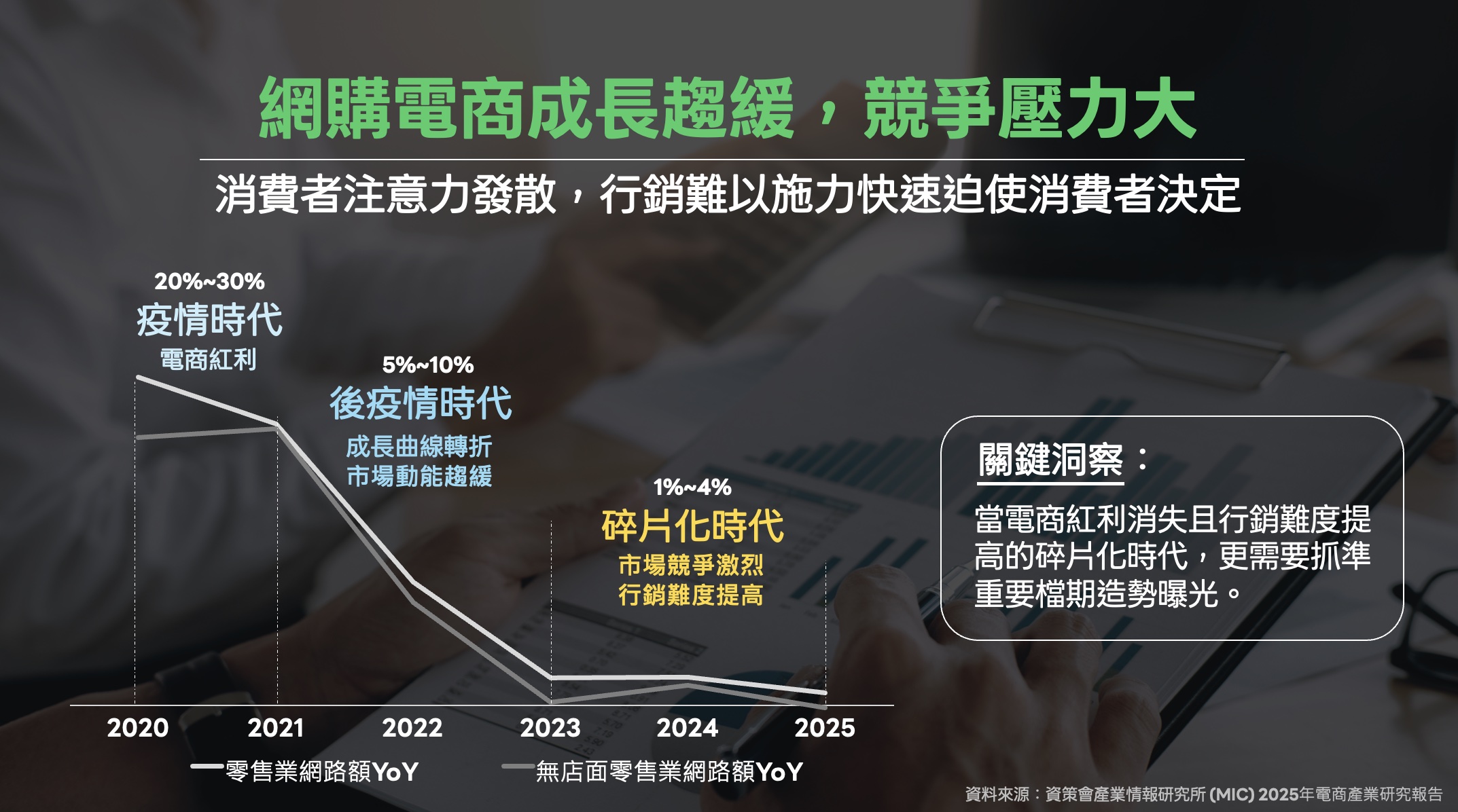 第二個挑戰來自於購物決策流程複雜化,加上市場大環境買氣不如以往。根據資策會產業情報研究所2025年電商產業研究報告,從2023年之後電商紅利消失,年營業額成長率從早年20%~30%,下降到現在只剩1%~4%。這也說明市場競爭激烈、行銷難度提高,品牌更需抓準重要檔期造勢曝光。